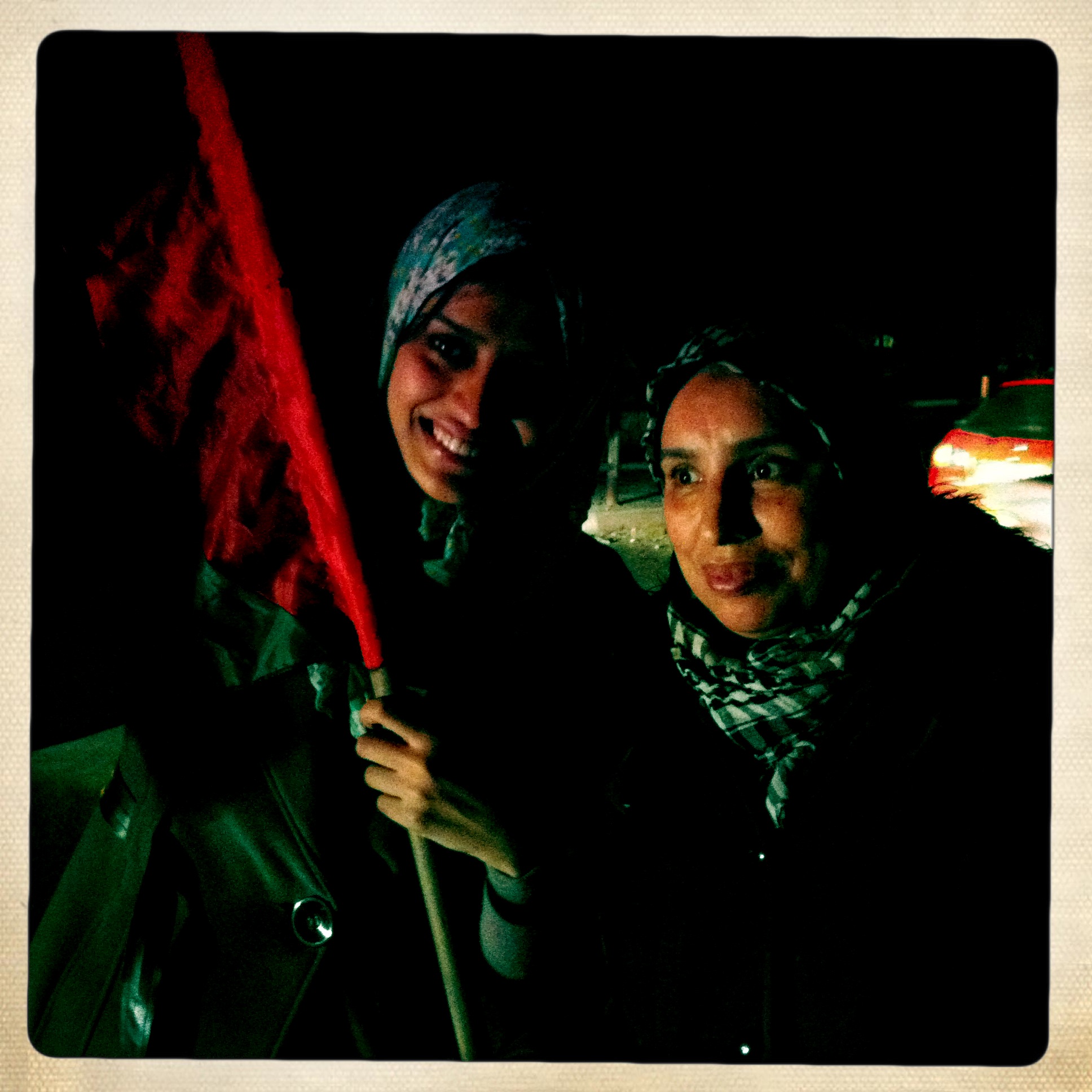 Mum and I in the street raising the Palestinian flag, joining the crowds of people who started celebrating victory after the truce started at 9:00 pm on November 21