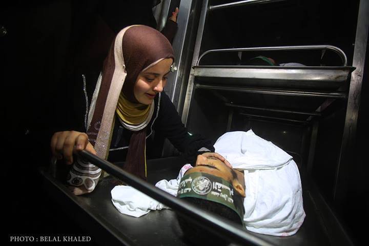 “Our honeymoon will never last my love!” The fiancee of yesterday’s martyr Abderrahman Al-Zamli having her last look at her martyred groom.